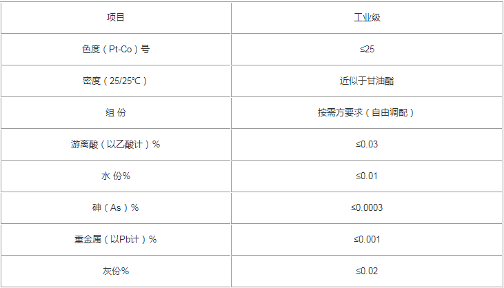 無色透明、無嗅油狀液體;微溶于水、易溶于醇、醚和其它有機(jī)溶劑。其它物化性能類似于三醋酸甘油酯。